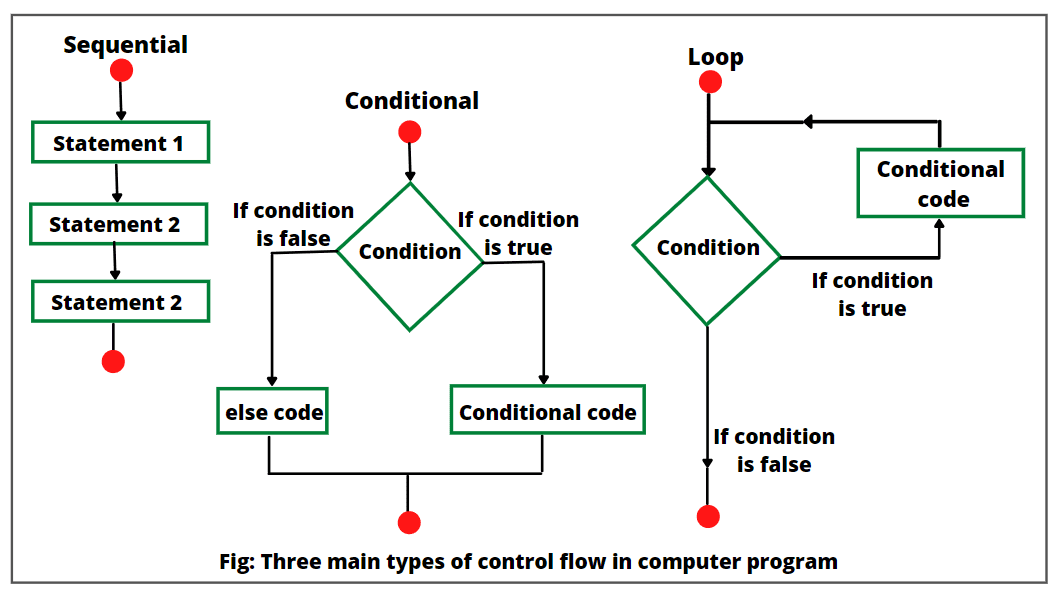 Control Flow is how the computer specifies the sequence in which a code executes, usually in a top-down manner, unless the code control changes its course when it meets with other structures. One example is the loops. A loop is a conditional statement that repeats the given task until the given condition is met. Let’s think of baking and icing a birthday cake. We would need to follow instructions on how to bake a cake and we will continue icing it until we reach our desired look on the cake.